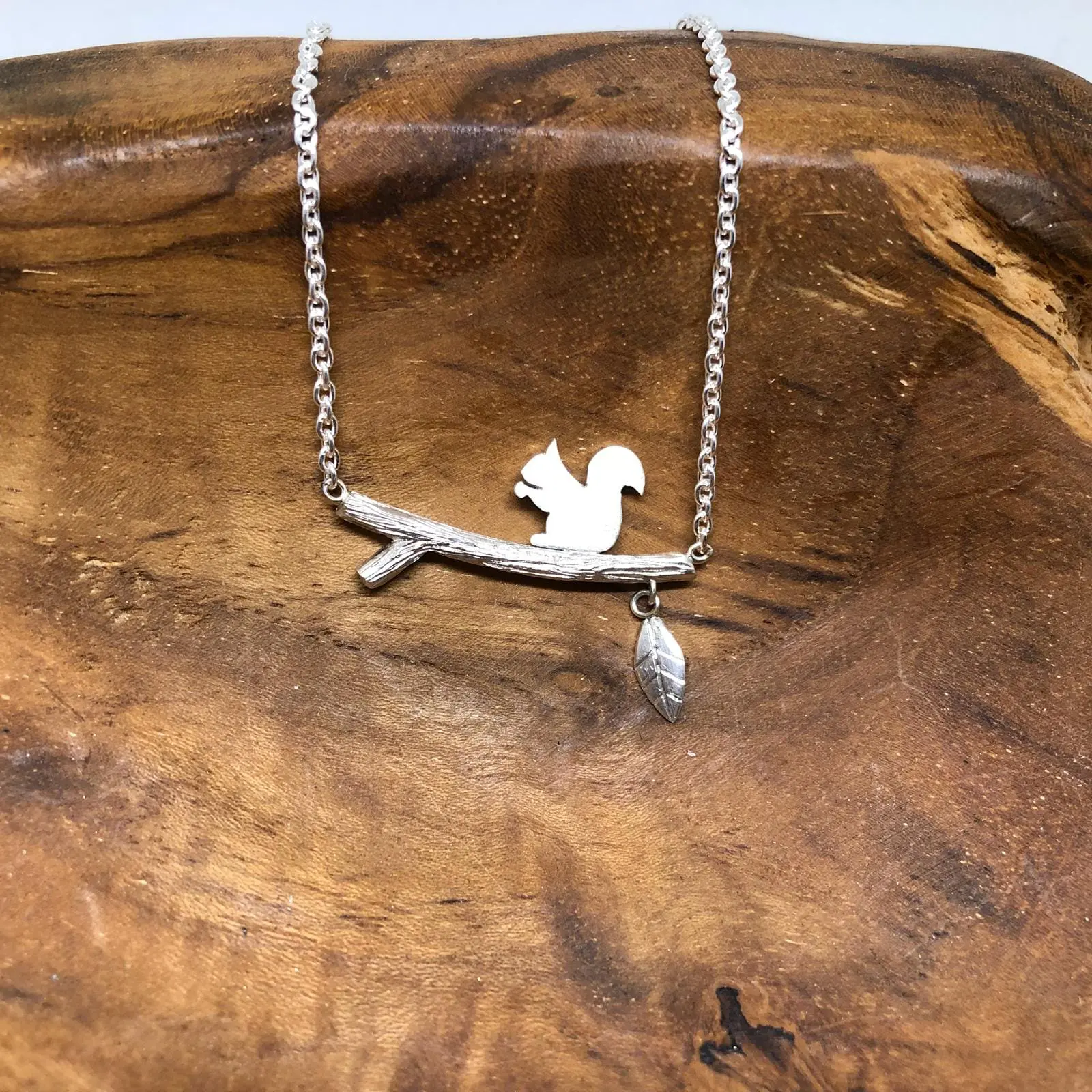 Silberkette mit .925 massivsilberner Silhouette eines Eichhörnchens (ca. 7 mm) auf einem Ast.